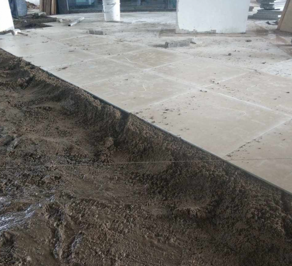 Removing floor tiles down to the level indicated by stone markers (arrows). This service involves carefully breaking and clearing away existing floor tiles until reaching the specific depth or level marked by stone arrows, preparing the area for subsequent flooring work or renovations while adhering to the indicated reference point.